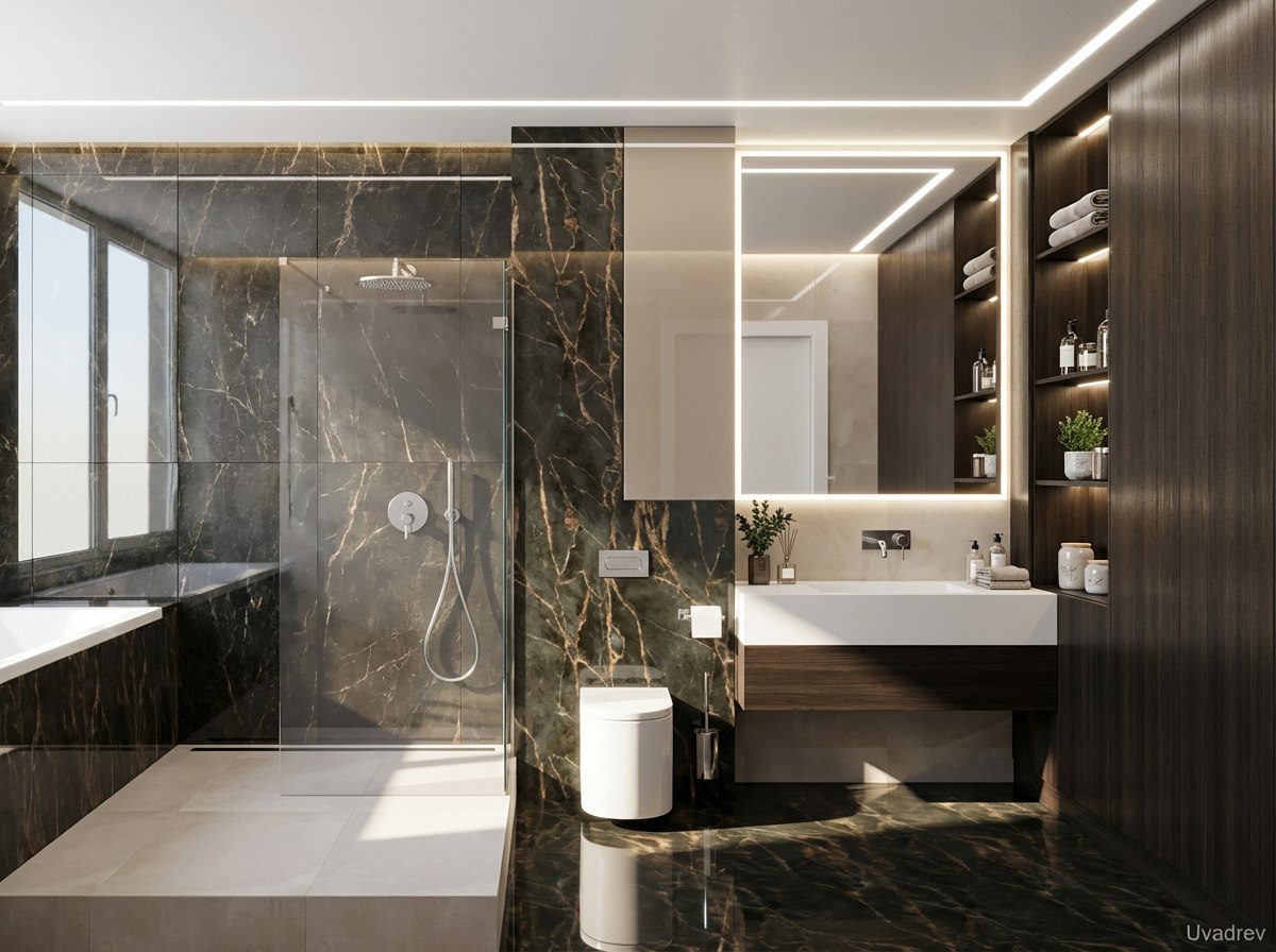 Сгенерируй фото из эскиза. На правой стене - окно. Добавь солнечный свет из окна. Повесь на окна черные жалюзи. Добавь смеситель для ванны. Темная плитка под мрамор - глянцевая. Где светлая плитка - песочного цвета, матовая. На стене - зеркало. Поставь в нишу у зеркала декор. Слева на фронтальной стене ниша - сделай в нише led - подсветку и поставь декор. По периметру помещения на потолке сделай скрытую led-подсветку. Поставь у ванны живой цветок в стильном горшке.